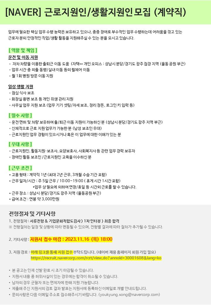 [NAVER] 근로지원인/생활지원인 모집 (계약직)