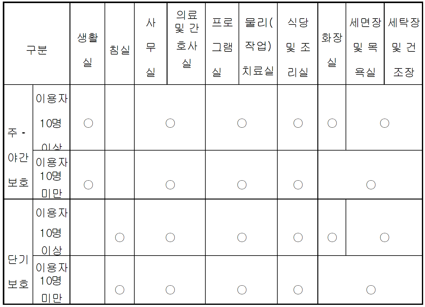 1. 주·야간보호 이용자가 10명 이상인 경우, 사무실과 의료 및 간호사실은 공 간을 함께 사용할 수 있으나 각각의 시설에 대한 기능은 모두 갖추고 있어야 한 다.