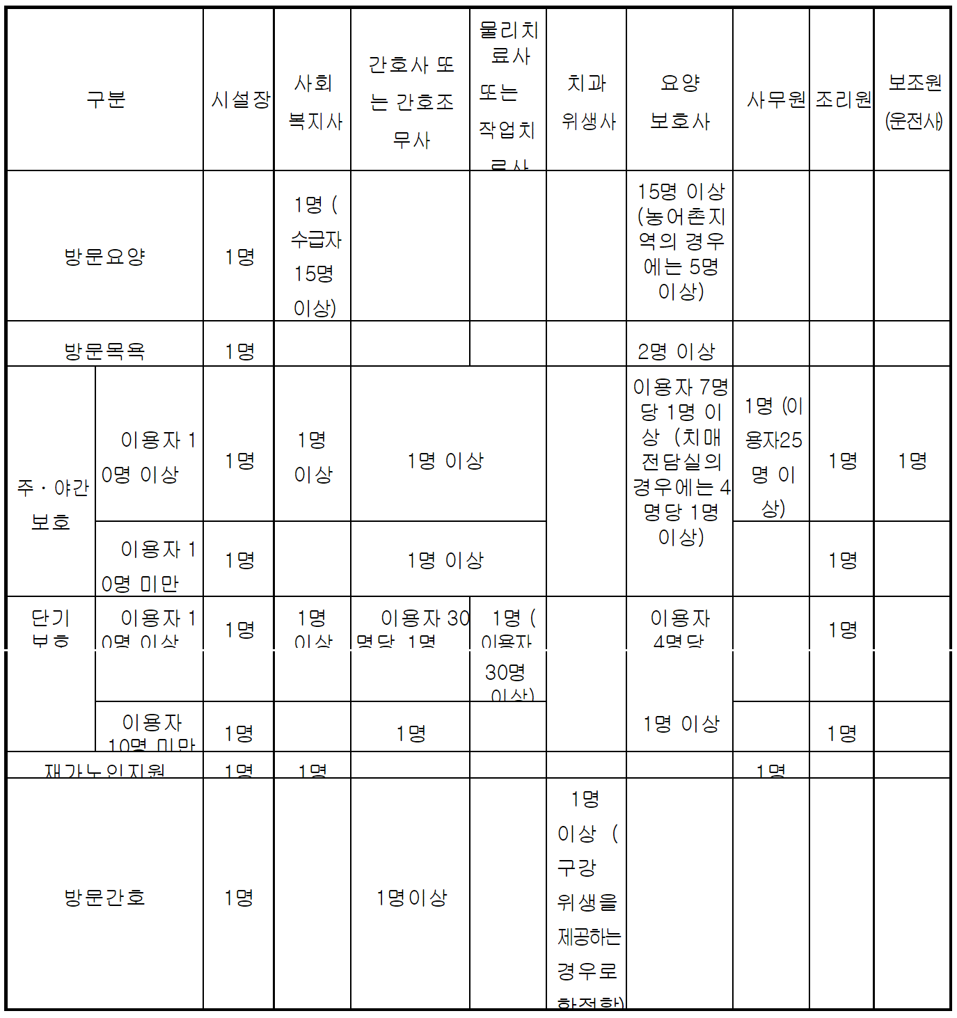 가. 방문요양, 방문목욕, 주·야간보호, 단기보호, 재가노인지원 및 방문간호서 비스를 제공하는 시설은 다음 기준에 해당하는 인원을 두어야 한다.