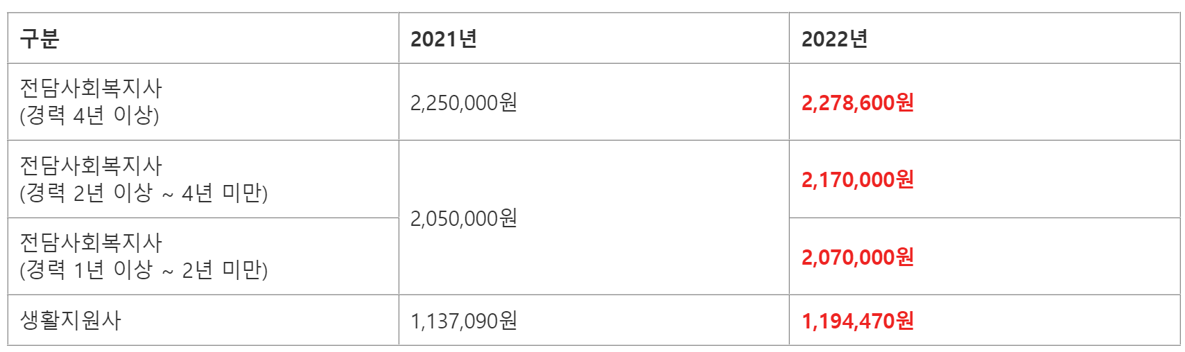 💬커뮤니티 [복지]질문과 답변 () 2022년 생활지원사 월 급여 및 근무 시간 익명 2022.10.20 - 09:15 4057 노인맞춤돌봄서비스의 돌봄수행인력인 생활지원사와 전담사회복지사의 2022년도 월 급여입니다. 2022년 생활지원사 및 전담사회복지사 월 급여 * 4대 보험 본인부담금 포함 근무시간 및 근무장소 Love 0 Attached file 2022년 생활지원사 월 급여 및 근무 시간 - 복지 질문 - 요양보호사 구인구직 카페 (1) 60.7KB 17 2022년 생활지원사 월 급여 및 근무 시간 - 복지 질문 - 요양보호사 구인구직 카페 (2) 79.3KB 17 이 게시물을.. N 0 0 "요양병원 문 닫는다"‥ 고령친화산업도 이제는 '옛말'발자취 댓글 쓰기 에디터 사용하기 닫기 글쓴이 비밀번호 댓글 등록 view_headline 목록